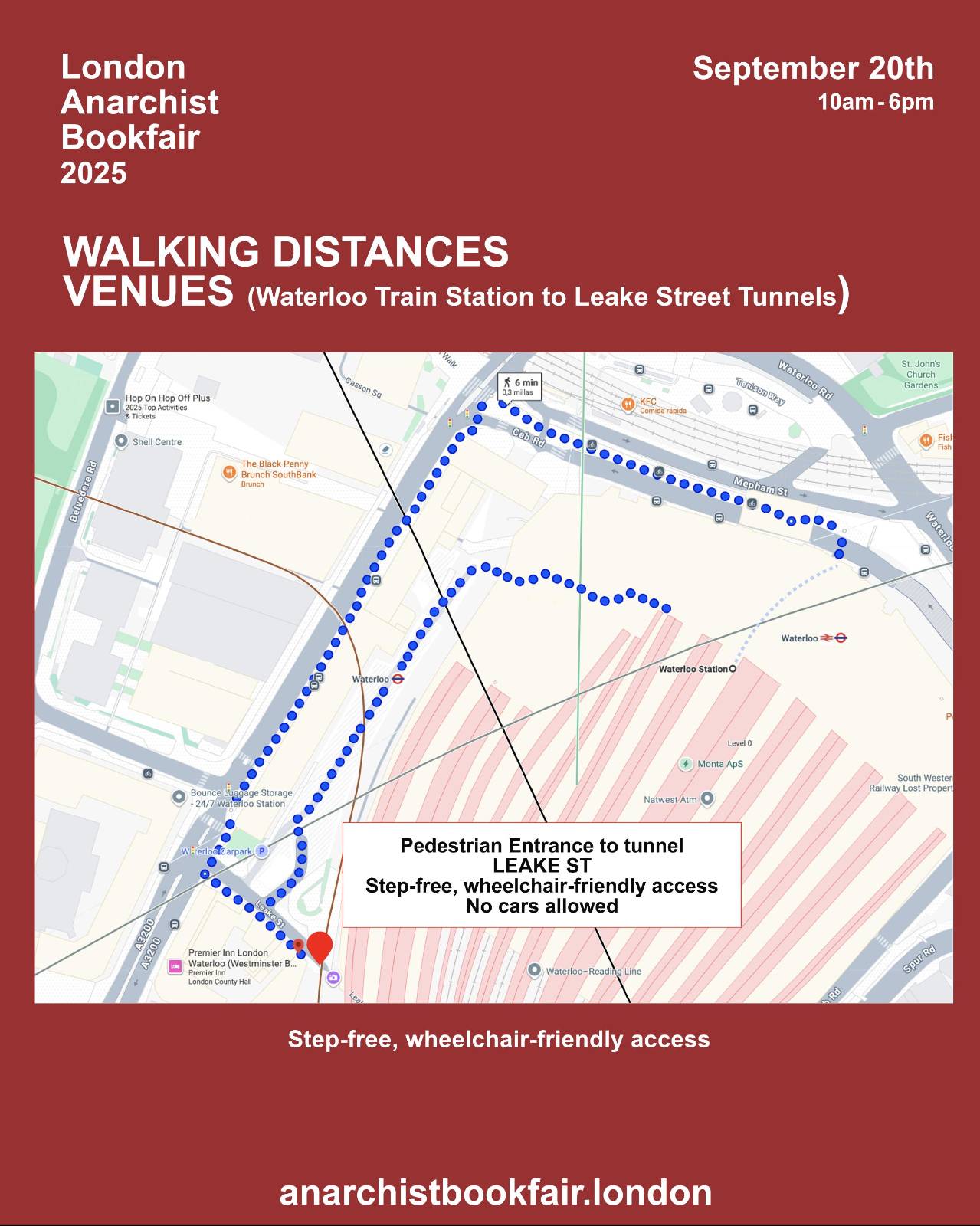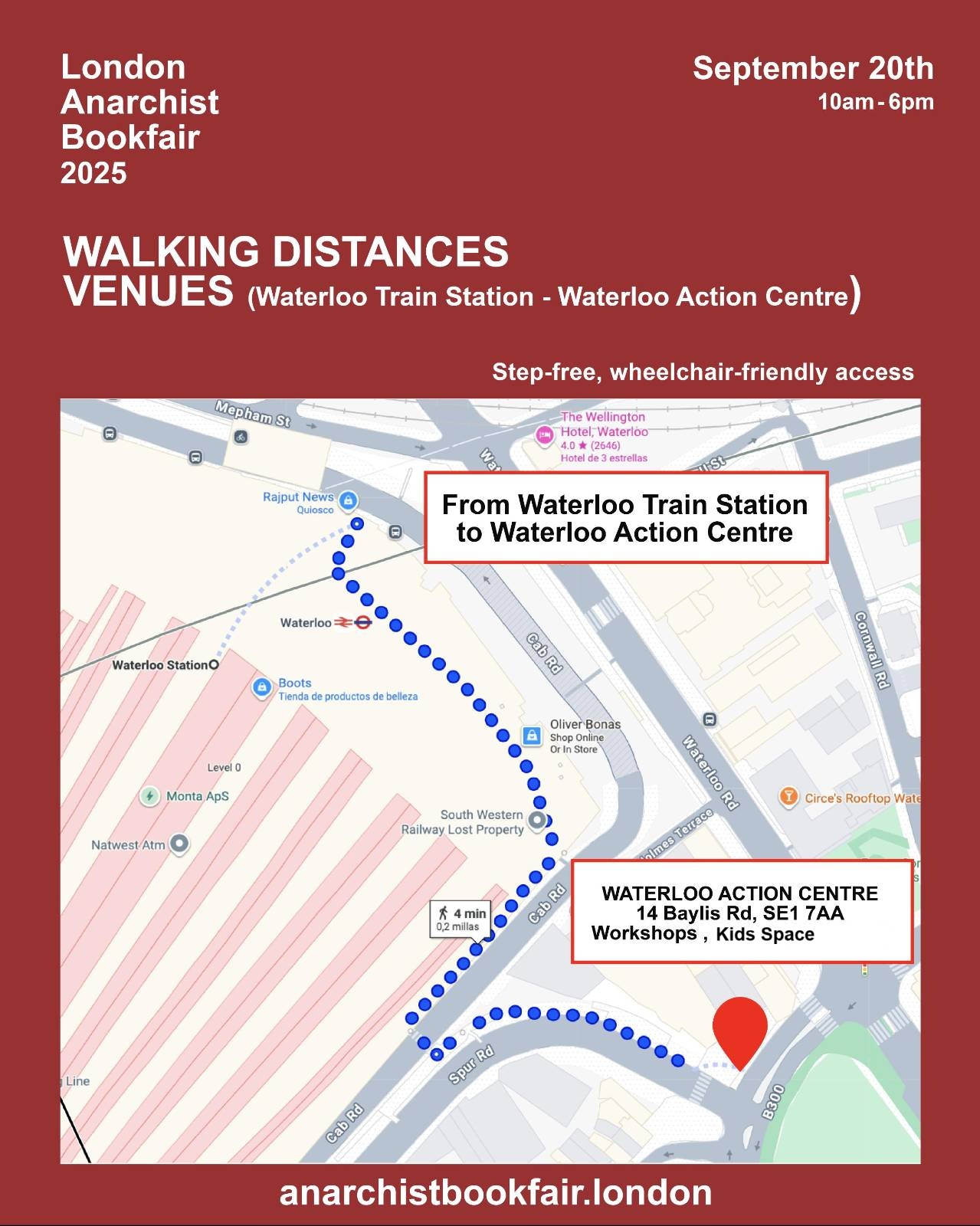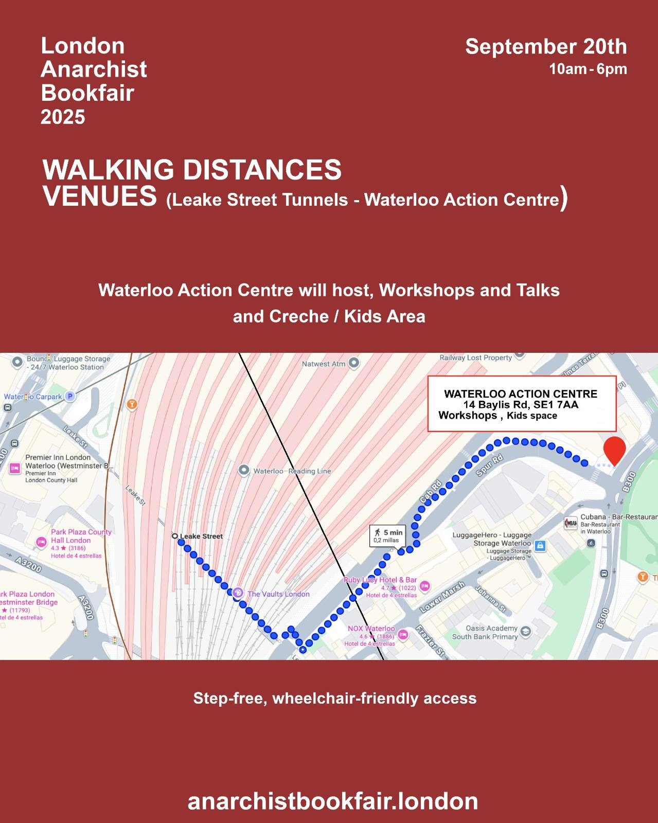 We’ll do our very best to ensure that the venues we use are as accessible as possible for everyone regardless of whether the concern is physical or mental. We’re limited by the constraints of organising a large event, in an over-priced city, on a very tight budget so we’re forced to make compromises. If you have any other requests or comments, please let us know anarchistbookfairlondon(at)riseup.net. We welcome feedback and will do our best to meet any requests. Accessibility is a journey not a destination and we want to keep moving in the right direction.