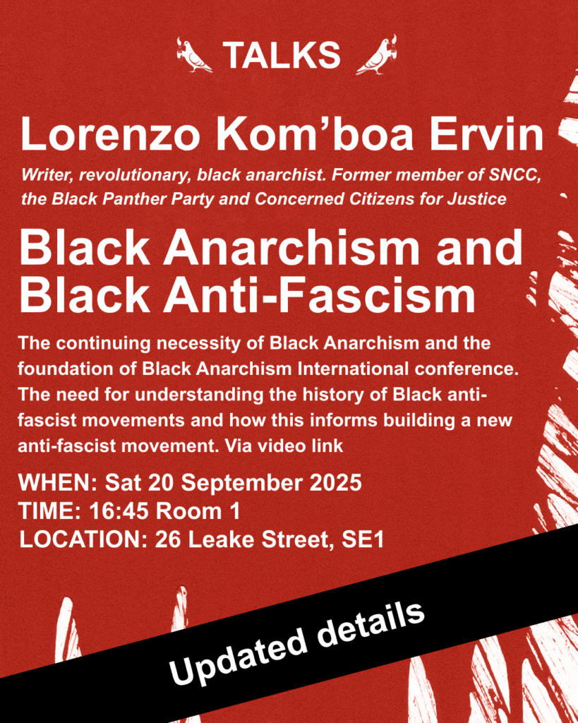 The US anarchist and former Black Panther will speak on the continuing necessity of black anarchism, and about building a new anti-fascist movement, recognising the importance of black anti-fascist movements of the 1960s and 1970s that created the National Committees to Combat Fascism. He will discuss how understanding European colonialism, and its maltreatment of African peoples, is important to any discussion of Fascism. The talk will be followed by a Q and A session.